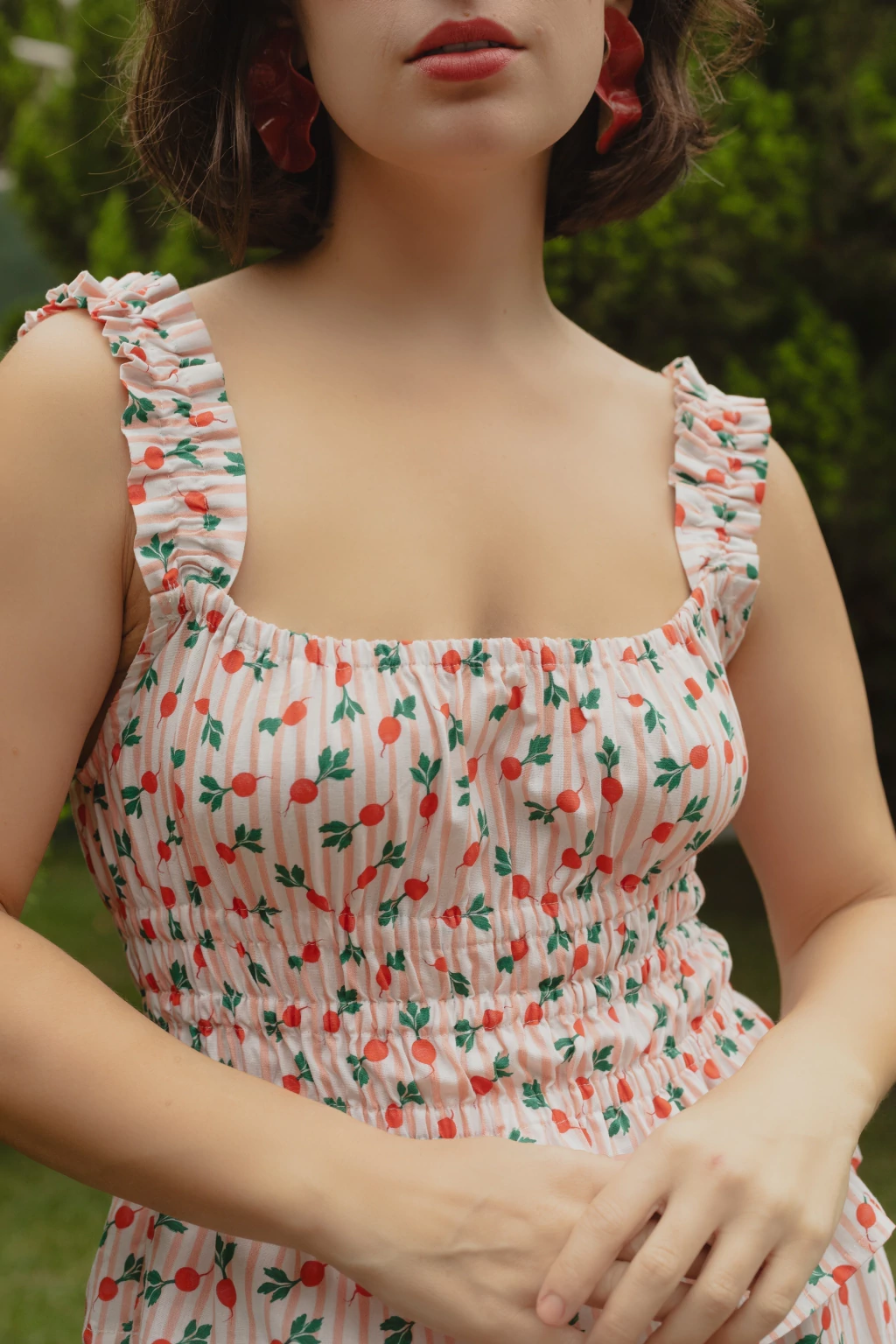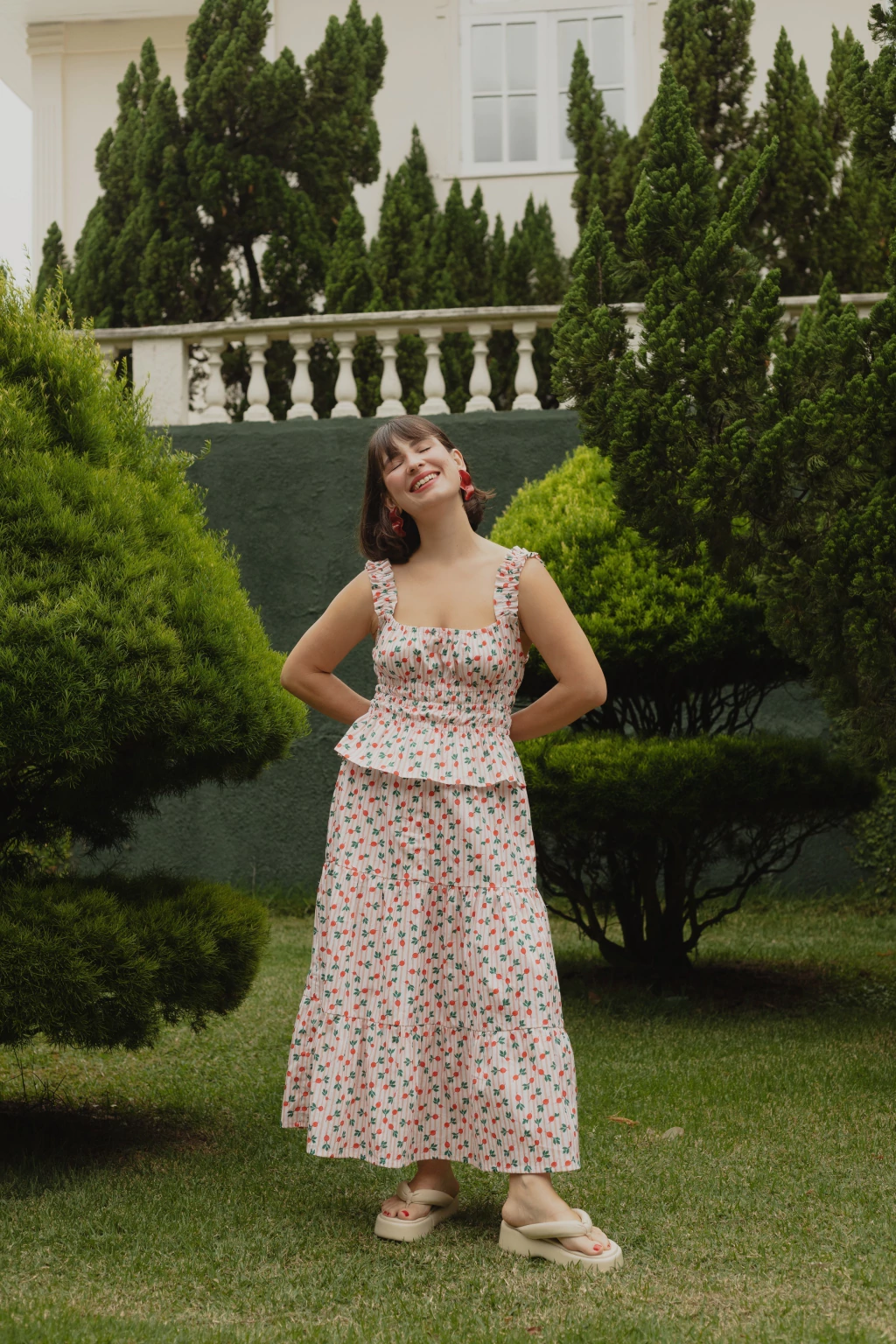 Blusa feita em tricoline estampada, modelagem ajustada e com peplum na barra. Possui três camadas de elástico para delinear a cintura e babadinho nas alças.