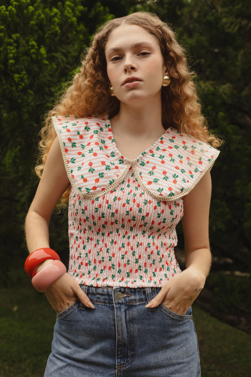 Blusa golão feita em tricoline estampada, toda em lastex, com aplicação de renda na gola.