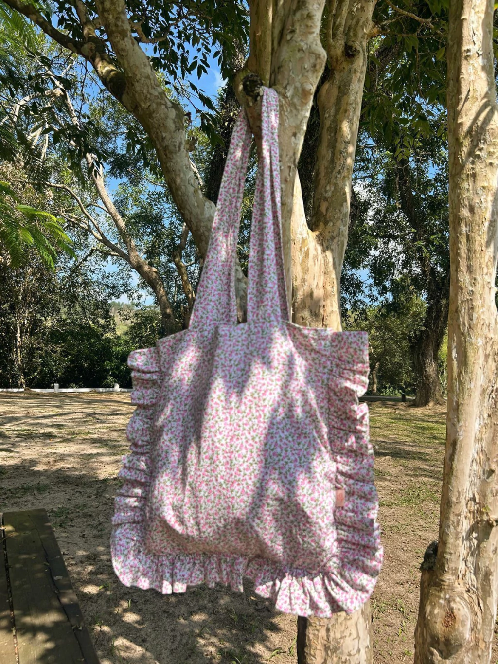 Bolsa retangular em tricoline estampado, com babados e bolso interno. Medida: 40cm x38cm