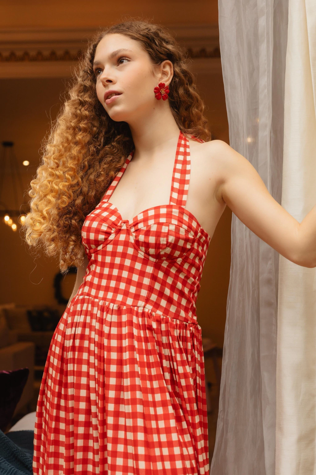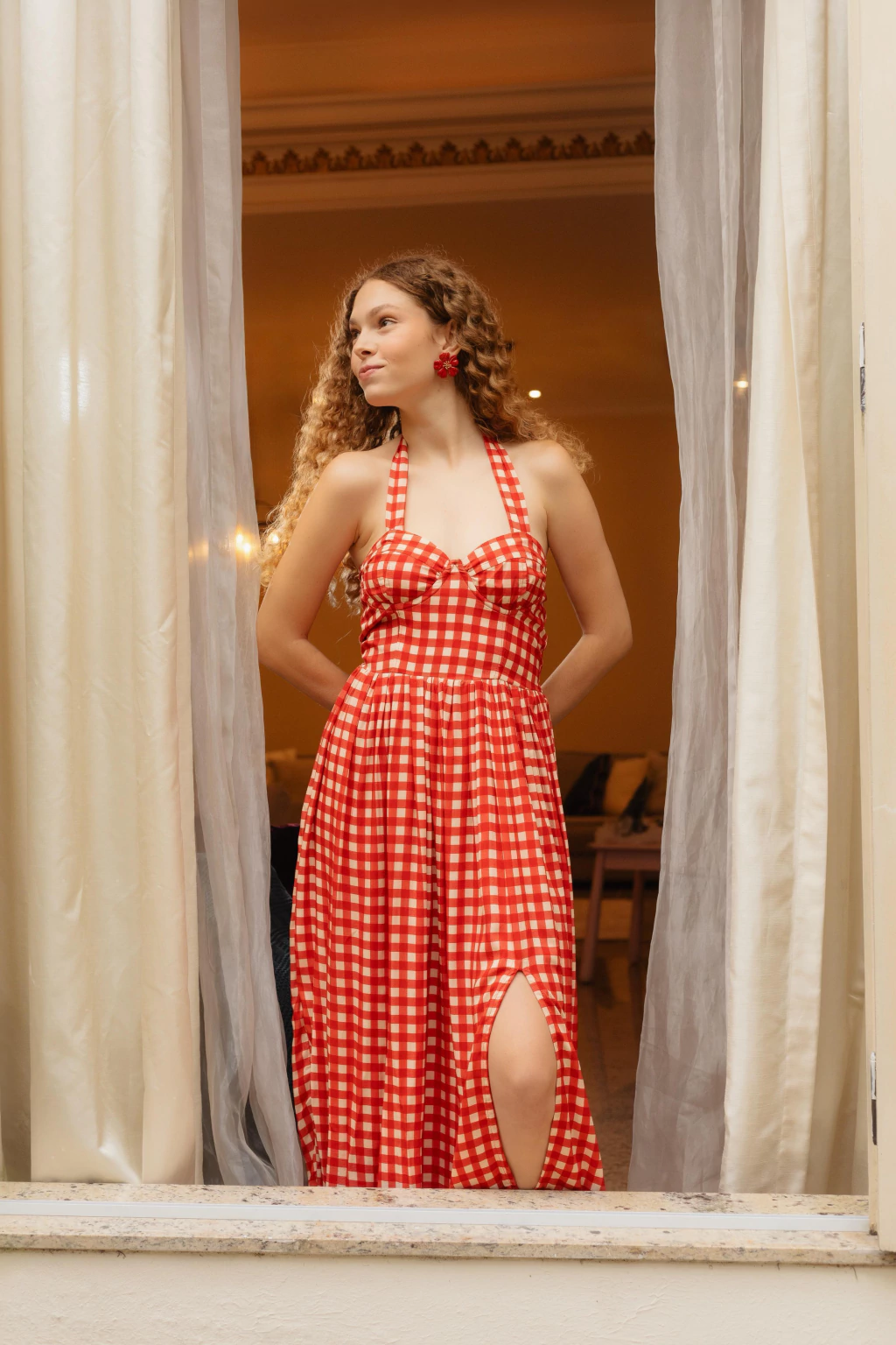 Vestido com estampa xadrez vichy, fluido, com fenda frontal, decote estilo "corset" e saia evasê. Pode ser usado tomara que caia, frente única ou com alças retas. possui lastex nas costas para maior conforto. Acompanha Faixa.